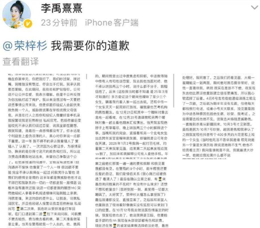 这事不是普通的吵架分手,李禹熹说荣梓杉同时跟四个女生来往,他平时冷着她,不回消息,也不露面,还威胁她说要曝光她的隐私,那天晚上他把她推倒,用脚踹她,事情闹大后,他经纪人出来讲李禹熹是私生饭,是自己闯进他家的,这话一出,很多人就信了,觉得是粉丝太疯了。